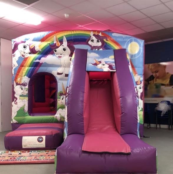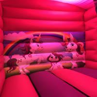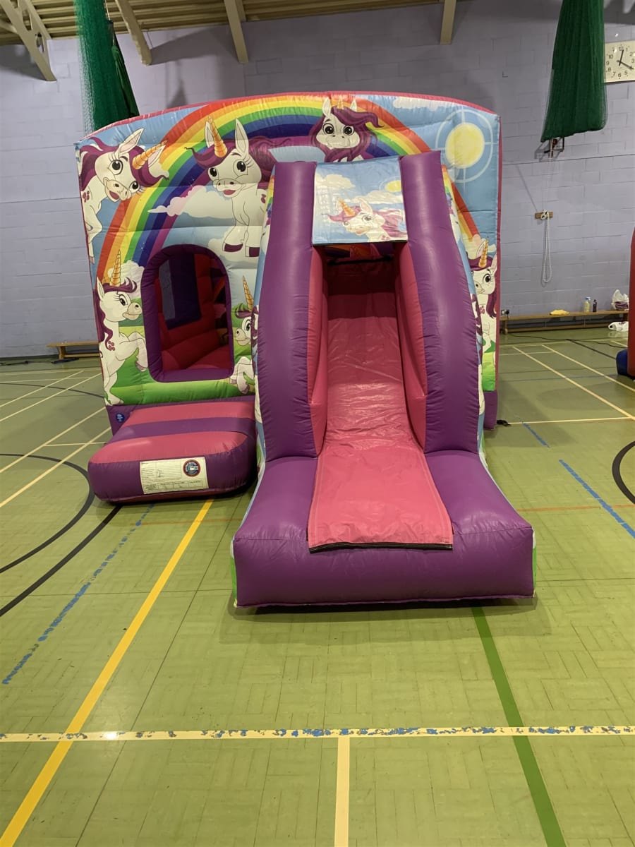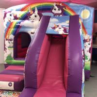 Unicorns Are Awesome Bounce & Slide Bouncy Castle. A little girls dream her own Unicorn Themed Bouncy Castle. Very popular for obvious reasons, Its Pretty and has Unicorns. This Bouncy Castle its a safe 'indoor' bouncy castle which also has a mini slide to the front of it. We like to call it a 'bounce house' as when the children are inside they are secured by inflatable walls and safety nets, just like being indoors. To the front of the bouncy castle there is a mini slide with a very safe short drop. The bottom of the entrance step and the slide are always covered with safety mats although that does not show in our photo.