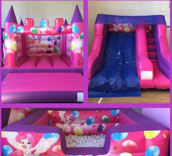 This is our Fairy Princess package, Perfect for little Princesses up to around 8 year olds so great for any party where the age gaps is a bit big and you have both little ones and slightly older ones to entertain. All 3 inflatables come in the same theme and are the smallest castle, slide and ball pool we have.