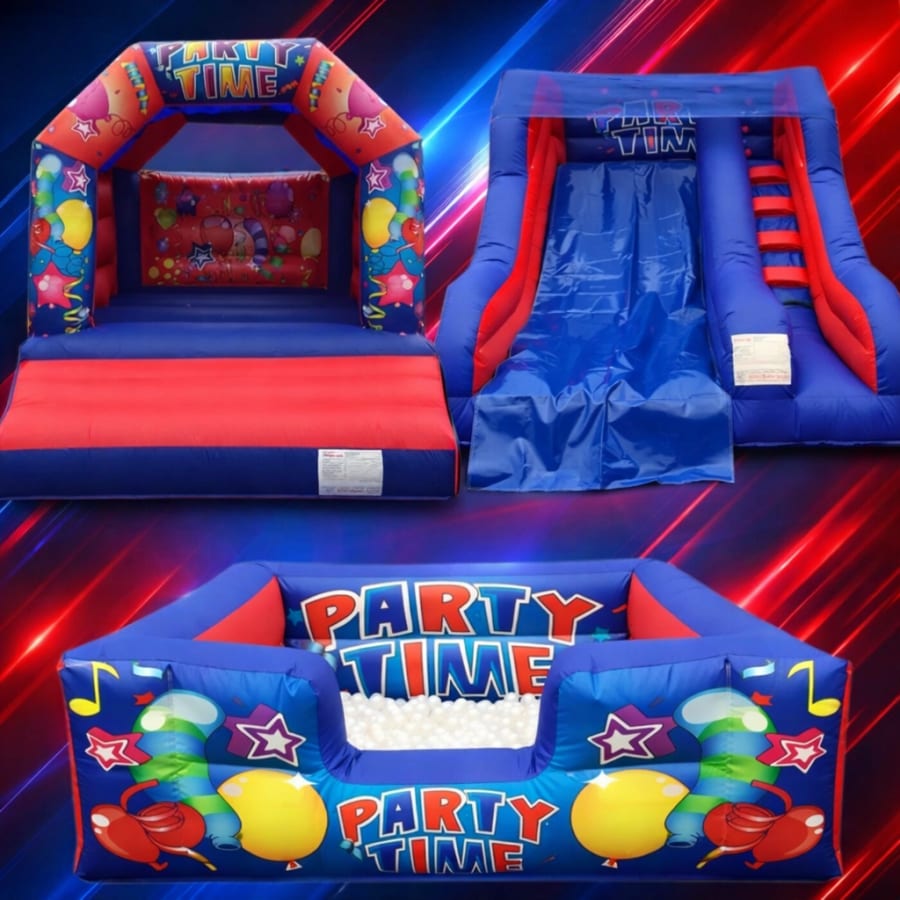 This is our Party Time Package, Perfect for toddlers and kids up to 8 year olds so great for any party where the age gaps is a bit big and you have both little ones and slightly older ones to entertain. All 3 inflatables come in the same theme and are the smallest castle, slide and ball pool we have.