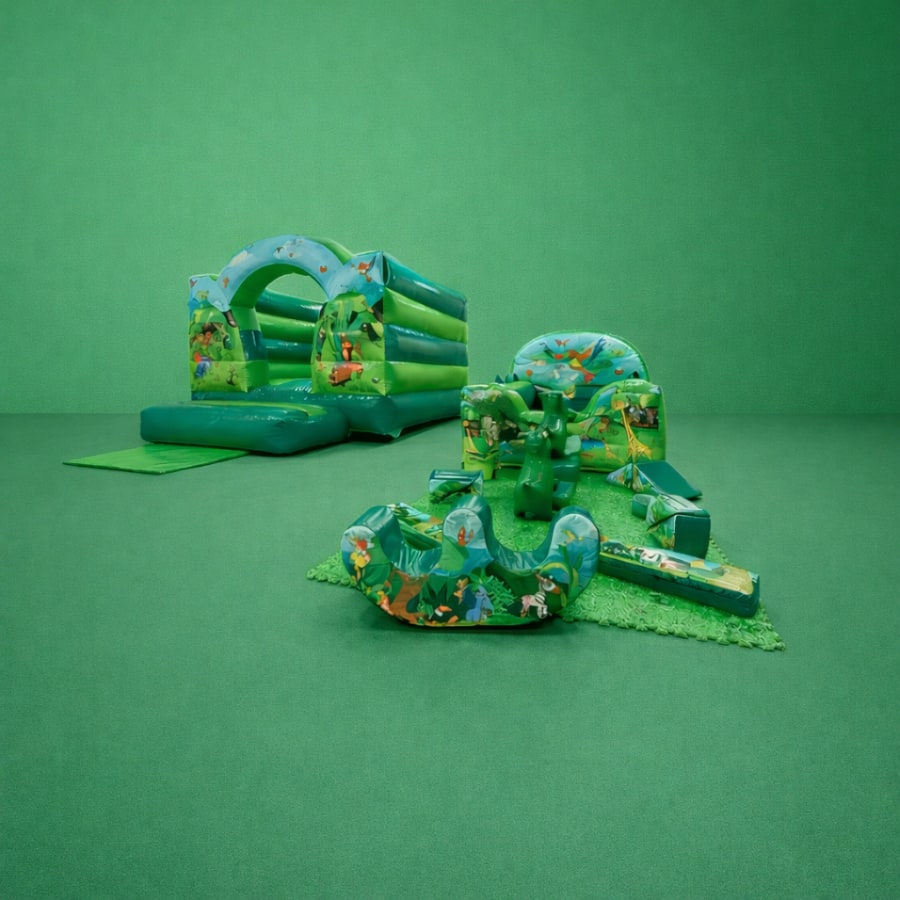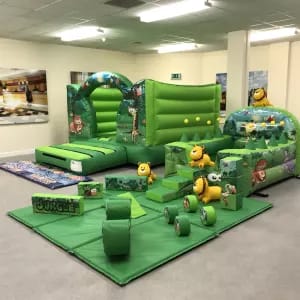 This is Perfect for all the cheeky toddlers and bigger kids so great for any party where the age gaps is big and you have both little ones and slightly older ones to entertain. The Bouncy Castle has an secured bouncing area with a low height so perfect for Low Height Venues and the Soft Play Set is fully matted with a ball pit and air jugglers, the floor is completely covered with fun and filled with Soft Play Shapes and a Matching Soft Play Rocker.